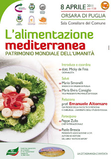 ORSARA DI PUGLIA - Lavorare insieme per la ricerca, lo sviluppo di professionalità e nuova occupazione attorno al tema del mangiare sano: è questo, in estrema sintesi, l'impegno scaturito dal convegno su "L'alimentazione mediterranea patrimonio mondiale dell'umanità" svoltosi a Orsara venerdì 8 aprile. L'incontro, promosso da Orsara Innova, è stato organizzato con la collaborazione di Provincia e Università di Foggia, Cittaslow, Proloco e Comune di Orsara di Puglia. Emanuele Altomare, già preside della Facoltà di Medicina dell'Università di Foggia, ha centrato la propria relazione sulle proprietà dei prodotti agroalimentari di Orsara, il loro altissimo contenuto nutritivo e gli effetti positivi di un'alimentazione basata sulla naturale assunzione di antiossidanti.