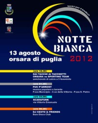 Sarà una Notte Bianca tutta da vivere quella che animerà piazze e strade di Orsara da stasera, lunedì 13 agosto, fino all’alba di martedì. La notte più lunga e musicale dell’anno, nel ‘paese dell’Orsa’, comincerà nel segno del calcio rosa: alle ore 18.30, nel Campetto Madonna della Neve, incontro amichevole di calcio a 5 femminile tra l’Orsara e lo Sporting Team. La festa vera e propria inizierà alle 21.30, quando Piazza Municipio, Corso della Vittoria e Piazza San Pietro saranno attraversate da i “Fuc P’Arrost”, uno spettacolo itinerante di musica popolare e taranta. Alle ore 23, in Corso Vittorio Emanuele, sarà la volta degli Skarafunk, gruppo musicale orsarese composto da Davide Tappi, Mariano Cericola e Pasquale Rinaldi. Dalle ore 0.30 e fino alle luci dell’alba, saranno protagonisti “DJ Cesto & Friends 2012” con il loro ‘Buio disco club’.Teatro, musica, gastronomia, ma anche sport, arte, fotografia e un’Estate Ragazzi ricca di avvenimenti ludico-educativi: tutto questo è “Made in Orsara, l’agosto a km zero” che sta animando i giorni e le notti del “paese dell’Orsa” per tutta l’estate.